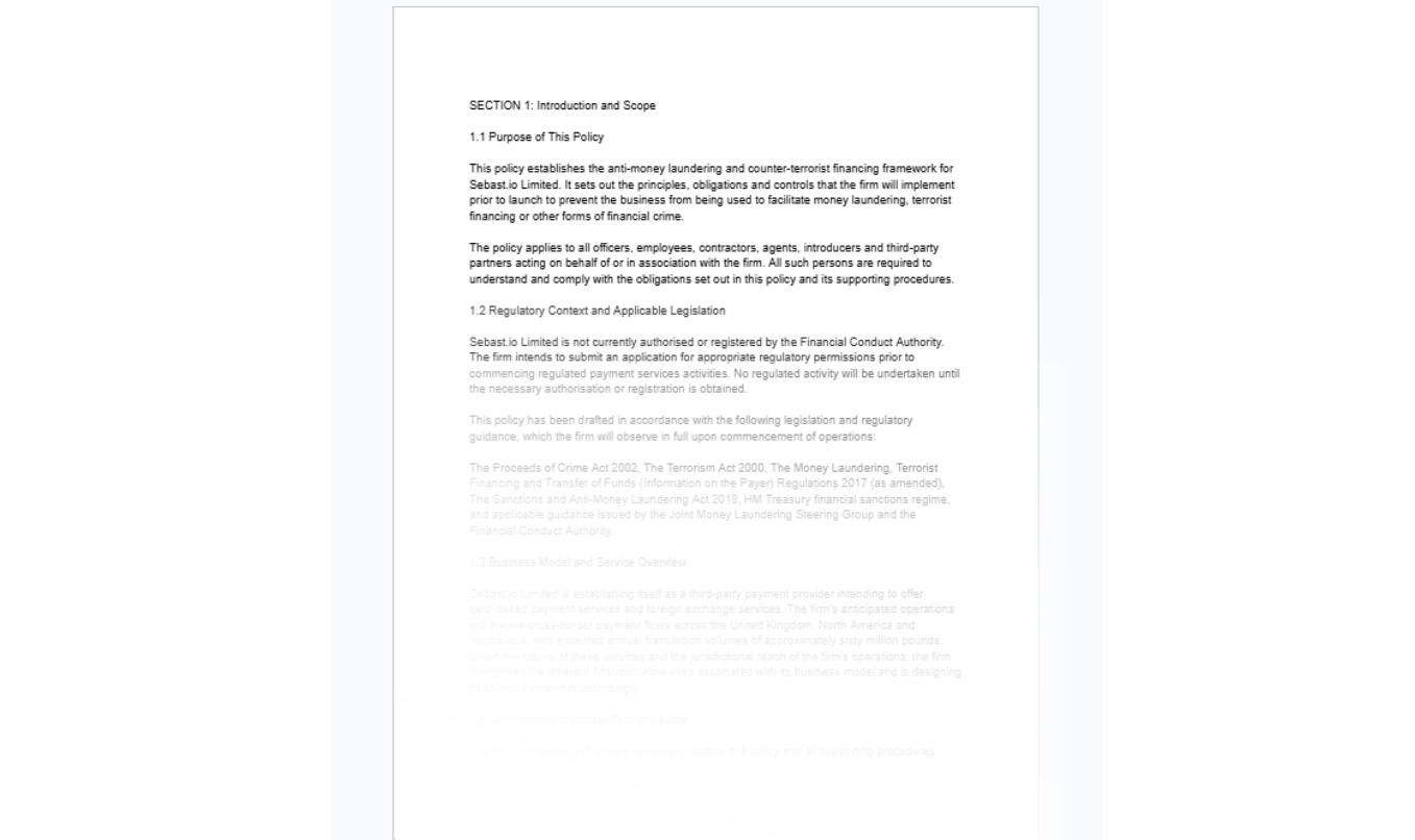 - Designed for early-stage UK fintech firms preparing AML documentation